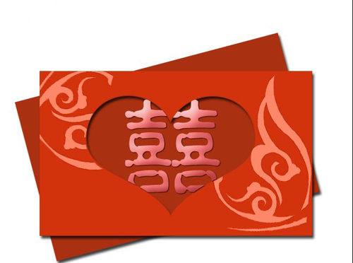 8、 选择中间有心的喜帖那个图层,ctrl+enter获得选区,点回字体图层,选择图层→栅格化→文字,最好按delete删除,这样囍字露在外面多余的地方就删除了。