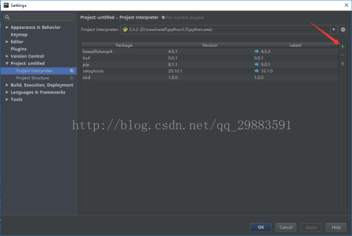 2、然后点击“+”号(由于我是提前下载好了的,所以下面的图中有xlrd的包):