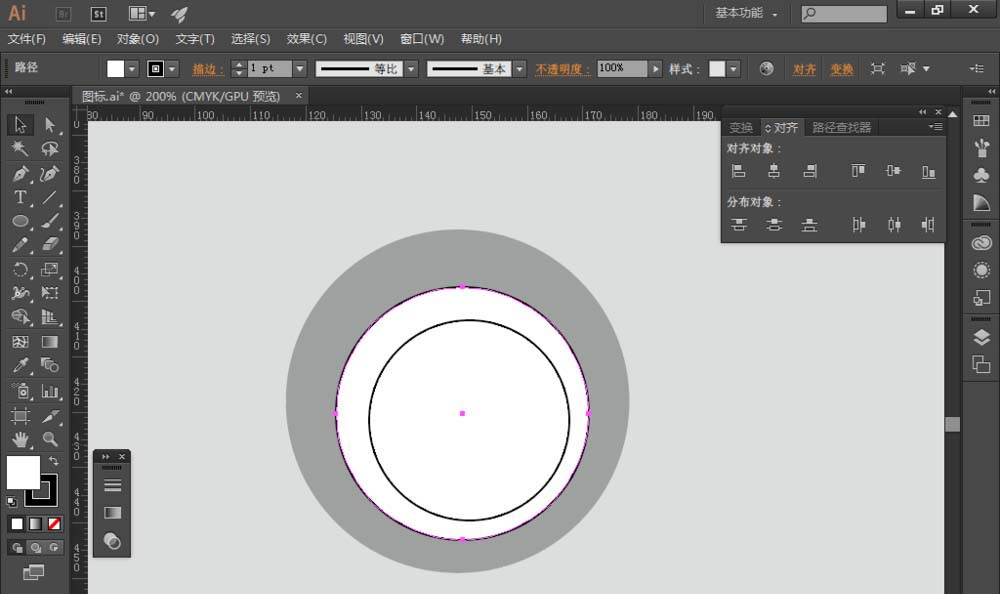 2、选择【椭圆工具】,绘制两个圆,如图1:同时选中这两个圆,找到【对齐】,选择【水平居中对齐】和【垂直居中分布】,让小圆图形相对大圆水平垂直居中对齐,如图2:在【路径查找器】中的选择【减去顶层】,创建一个圆环,如图3: