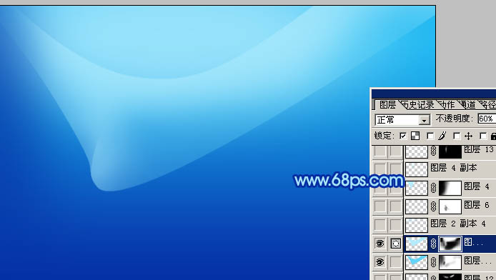 6、把“彩带1”图层再复制一层,图层不透明度改为:60%。加上图层蒙版,用黑色画笔,画笔不透明度设为:10%。然后在蒙版上慢慢涂抹,擦出明暗效果,如图10。