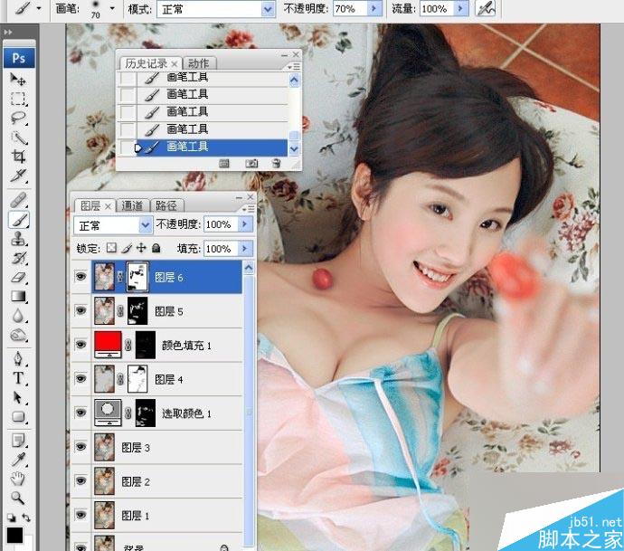 20.使用低透明度的白色画笔在人物皮肤上涂抹出红润色.