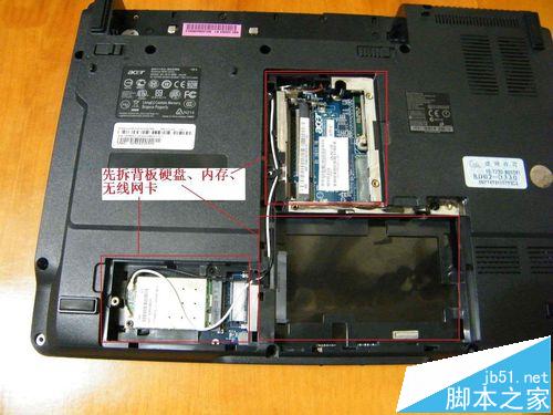 1、把笔记本翻过来把电池去掉,先取下背板的硬盘、内存、无线网卡后盖螺钉