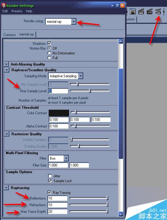 11 在mental ray卷下的渲染设置里,multi-pixel filtering选成mitchell。