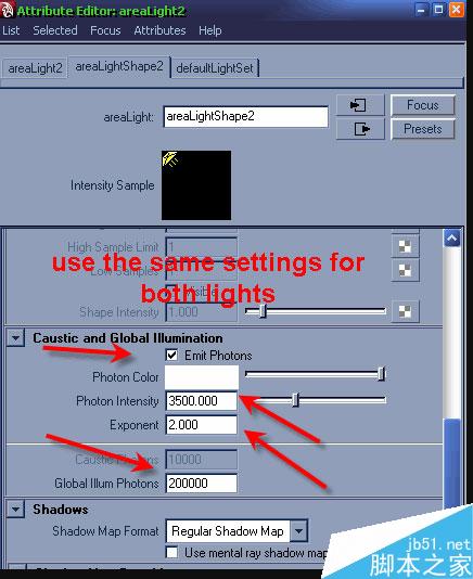 10 现在选择你的区域灯,打开emit photons(投射光子),然后用下面的设置,或者按你的场景大小来调节。光子的数量要视场景大小而定,如果你的场景很大的话,数量很少的光子是不会有什么用的。