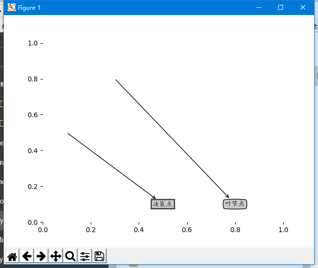 import matplotlib.pyplot as plt import matplotlib #定义自定义字体,文件名是系统中文字体 myfont = matplotlib.font_manager.FontProperties(fname='C:/Windows/Fonts/simkai.ttf') #解决负号'-'显示为方块的问题 matplotlib.rcParams['axes.unicode_minus']=False decisionNode =dict(boxstyle="sawtooth",fc="0.8") leafNode=dict(boxstyle="round4",fc="0.8") arrow_args=dict(arrowstyle="<-") def plotNode(nodeTxt,centerPt,parentPt,nodeType): createPlot.axl.annotate(nodeTxt,xy=parentPt,xycoords='axes fraction',xytext=centerPt,textcoords='axes fraction',va="center",ha="center",bbox=nodeType,arrowprops=arrow_args,fontproperties=myfont) def createPlot(): fig =plt.figure(1,facecolor='white') fig.clf() createPlot.axl=plt.subplot(111,frameon=False) plotNode(U'决策点',(0.5,0.1),(0.1,0.5),decisionNode) plotNode(U'叶节点',(0.8,0.1),(0.3,0.8),leafNode) plt.show()