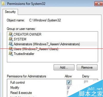 6、在用户名列表中选择你所要改变权限的用户名,和你刚做过更改的“所有者”保持一致,如果该用户名不在列表内,点击“添加”并键入姓名,权限设置后“完全控制”,点击“确定”即可;