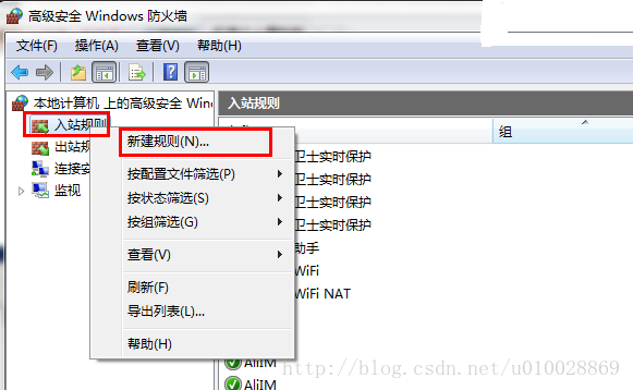 从上图中我们可以看出,这台SQL服务器上支持TCP/IP协议的是1433端口。下一步要做的是在防火墙的配置中允许1433端口支持TCP/IP协议即可。打开“控制面板”选择“Windows防火墙”——“高级设置”。右击“入站规则(Inboud Rules)”选项,选择“新建规则(NewRule)”: