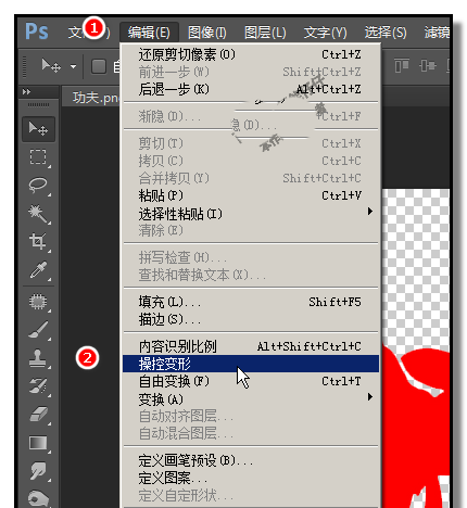 2、顺序点击:编辑-操控变形,这时,鼠标变成钉子的样子,然后,在人物身体各上部位点一下,每点一下,即下了一口钉,钉住所在位置,固定人物身体该部分。
