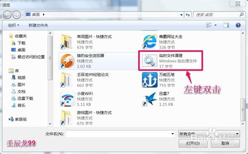 在打开的桌面中找到:临时文件清理.bat,并左键双击:临时文件清理.bat;