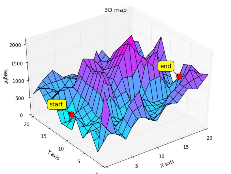 三维地形中,给出起点和重点,找到其最优路径。