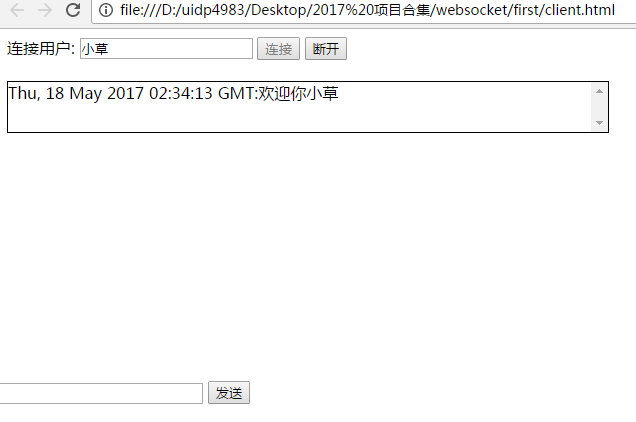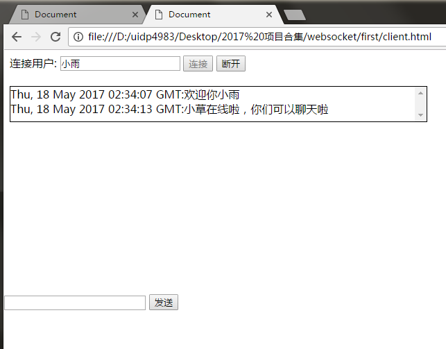 开启服务,相同页面执行两遍,就可以聊天啦。反正过程就是这样。就是还有一个大的问题。比如我a断开连接了,只有b一个人在连接巨人b还能发信息,可以发信息算可以吧。居然b自己接收自己的信息。那就不能忍了。