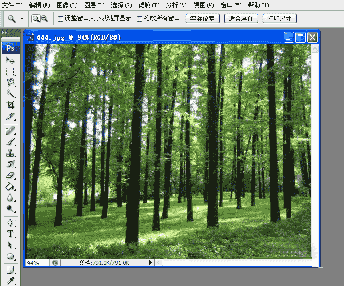 1、打开一张树林图片,图片左右选择,最好不要树林太密集的图片。