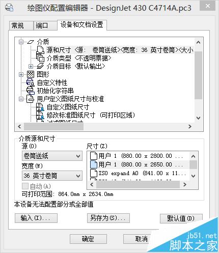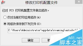 9、鼠标点击新创建的图纸名,如本例中是用户 2(880.00 x 2650.00 毫米),然后点击确定,出现修改打印机配置文件选项卡,选择将修改保存到下列文件,点击确定。