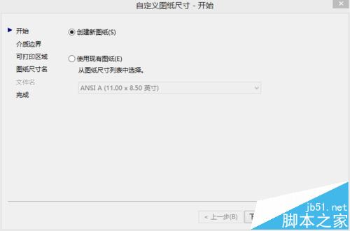 5、点击添加按钮,出现自定义图纸尺寸选项卡,选择创建新图纸,然后点击下一步。