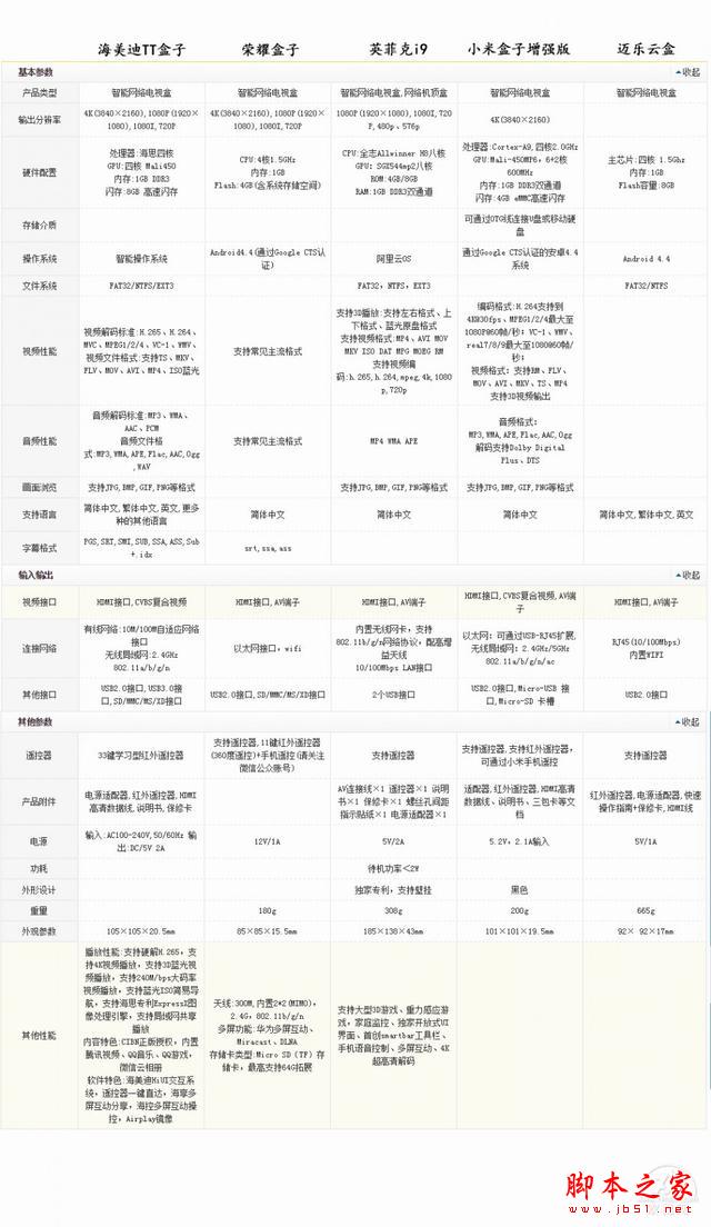 这五大热门盒子,大家都听说过,下面就用一张图分别从配置和跑分让大家了解的更透彻下吧。