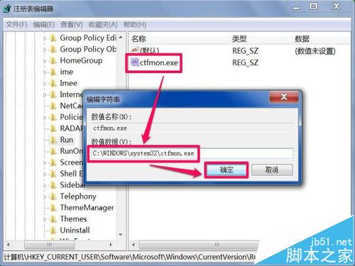 4、将这个新建项改名为ctfmon.exe,然后双击此项,在编辑字符串窗口,找到数据数值下的编辑框,在其中输入C:\WINDOWS\system32\ctfmon.exe这条路径,然后“确定”即可。