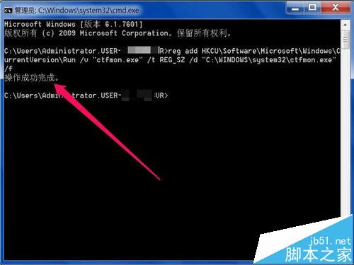 2、进入命令提示符窗口后,输入reg add HKCU\Software\Microsoft\Windows\CurrentVersion\Run /v "ctfmon.exe" /t REG_SZ /d "C:\WINDOWS\system32\ctfmon.exe" /f此条命令,按Enter回车,刷新一下,就可以显示输入法图标了。