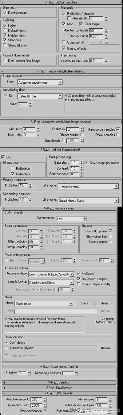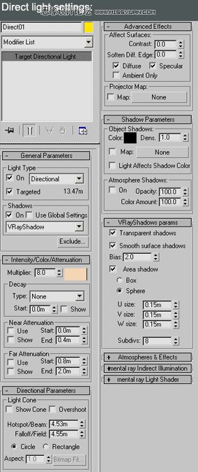 现在我们有了diffuse贴图,但是在制作材质之前我必须设置渲染参数。我提前做这一工作是因为光线是图画构思中最重要的部分,而材质要依赖这些参数设置。我制作了一幅布景图,其中有两个光源,一个用于全局照明,一个用于模拟太阳光。(图09)