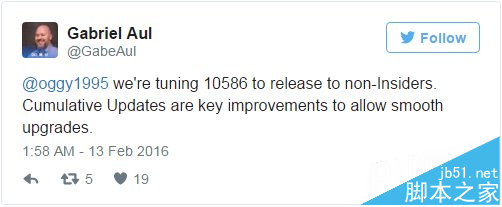 事实上,在新近的几个版本中,该公司注重于改善升级体验。Aul在昨日向慢速更新通道推送build 10586.107之后说到: