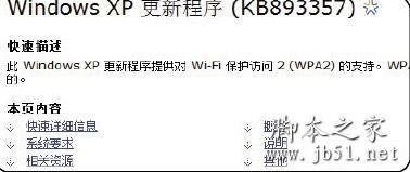 在WIN XP下,需要安装此补丁才能看到无线路由器设置的密码功能,如果路由器设置了密码,且你的电脑没有升级到 XP SP3的系统,那么就需要安装KB893357补丁。