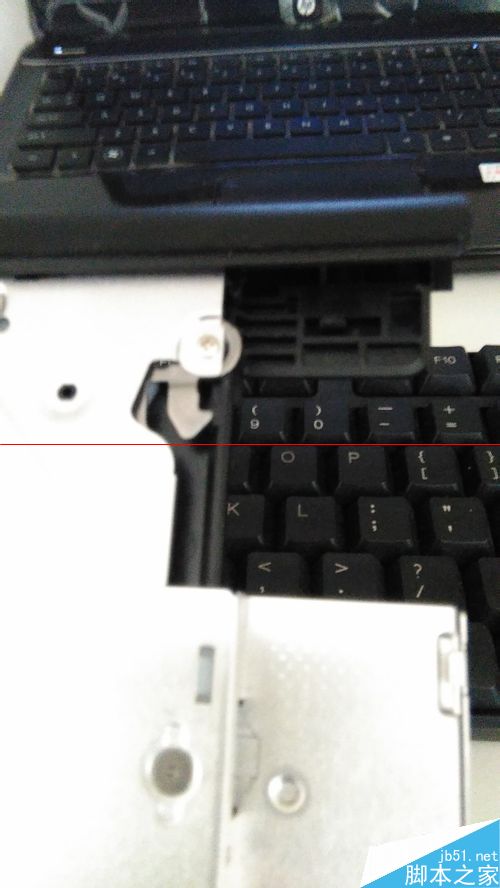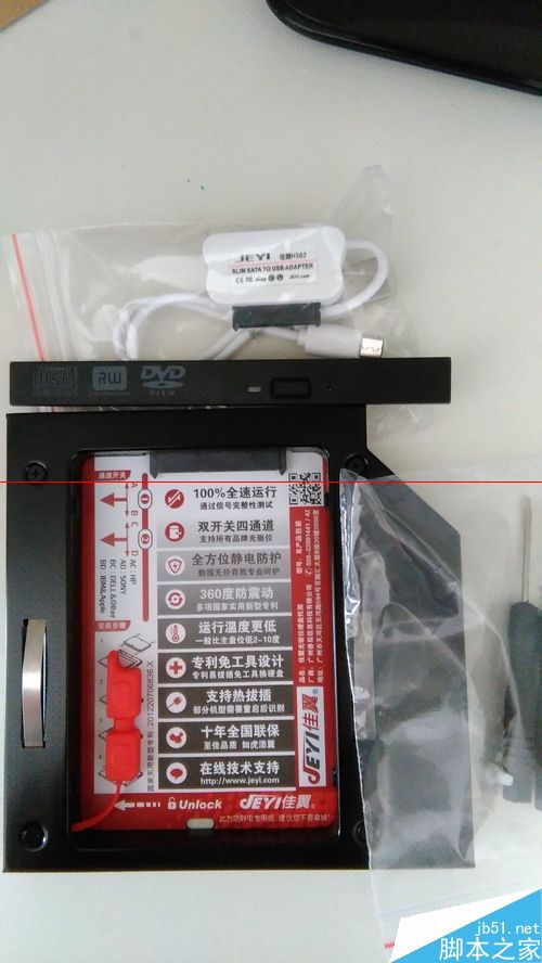 5、这里可以先把光驱固定支架扭好,佳翼H27多送了三个小螺丝;通过USB小光驱盒连接光驱,弹出托盘;小心拨动托盘侧面和背面的塑料卡扣,把光驱前盖去掉;把光驱前盖装到光驱位硬盘托架,托架上有个洞太小小,可以用配送的十字螺丝刀钻大点。