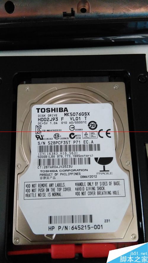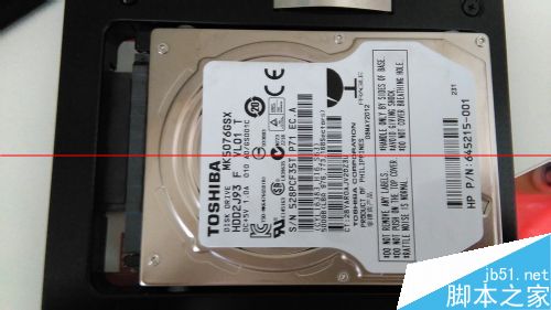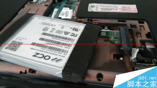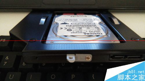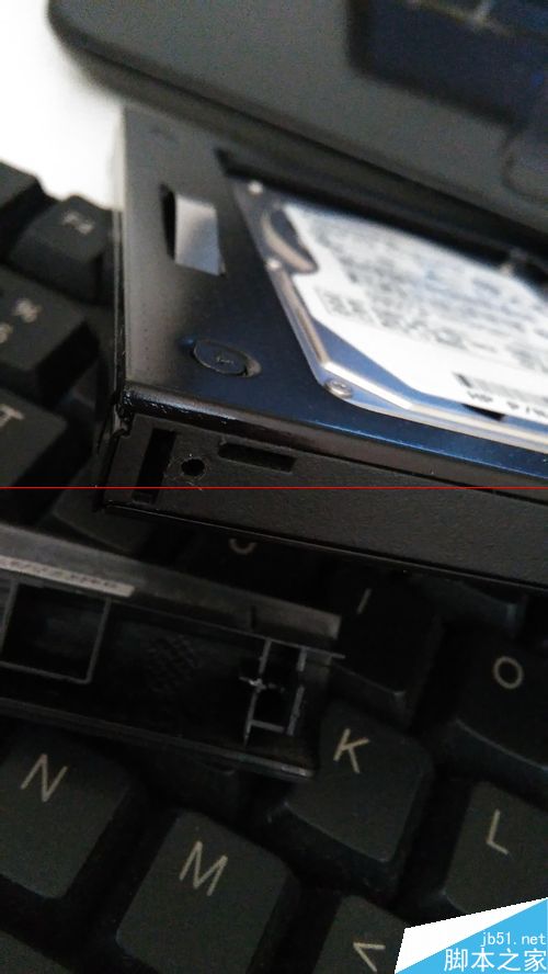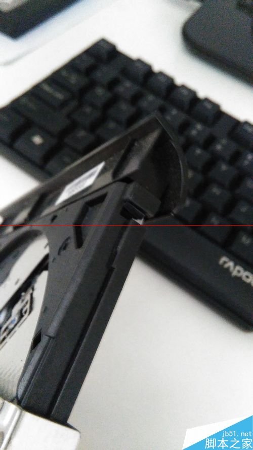 6、把送的四个塑料小螺丝扭到原来的机械硬盘上;塞进光驱位硬盘托架,向上滑进接口,把红色软胶条塞到底部;系统安装好后,关机,把光驱位硬盘托架装回去,用螺丝固定。