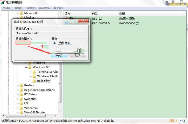 2、在注册表编辑器界面中,依次展开:HKEY_LOCAL_MACHINE\SOFTWARE\Policies\Microsoft\Windows NT\ Reliability。点击“Reliability”项,找到“ShutdownReasonOn”,如图5所示