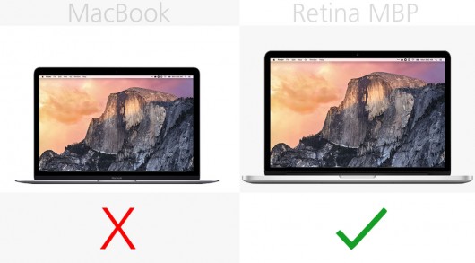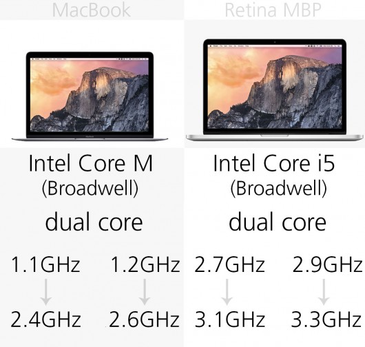 相比较rMBP来说,12英寸的新Macbook在处理器上采用了全新的Core M Broadwell处理器,使用该处理器能够让小尺寸设备获得更长的续航表现,但是在性能方面则有所缺憾。