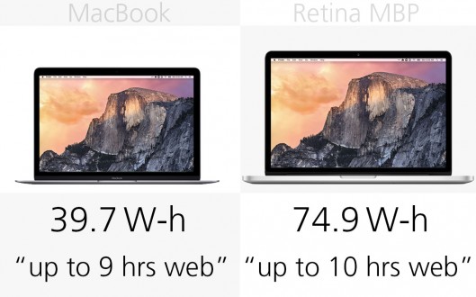 在电池方面两者容量不同,但是由于搭载更加省电的Core M处理器,连续上网时间为9小时,要比Macbook Pro小1个小时。