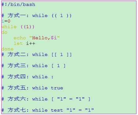 可是怎么在shell脚本中写死循环呢?这个时候同样用到while,归纳汇总了让Shell脚本一直运行下去的几种方式: