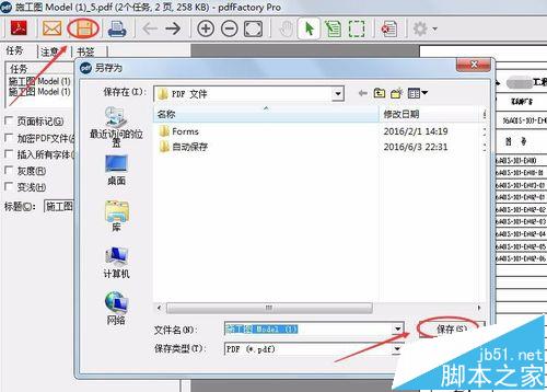9、点击界面中的保存图标,弹出对话框,选择保存的地房,改好文件名后,点击保存,就将多张CAD图纸打印成为一个PDF文件。
