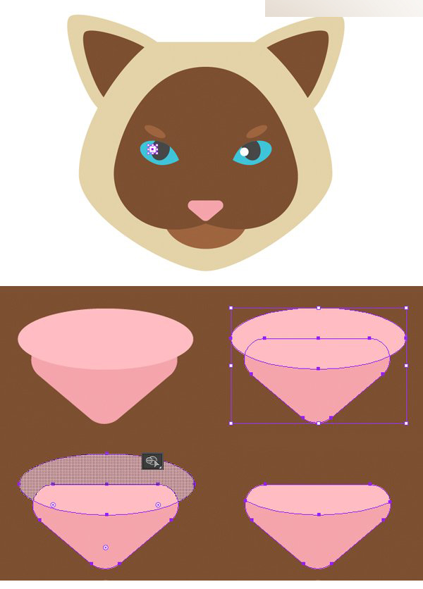 创建一个浅粉色的椭圆,将其放置在鼻子的上端的位置,然后利用形状生成工具(Shift-M)按住Alt键删除不需要的部分,因此使鼻子添加更多细节。