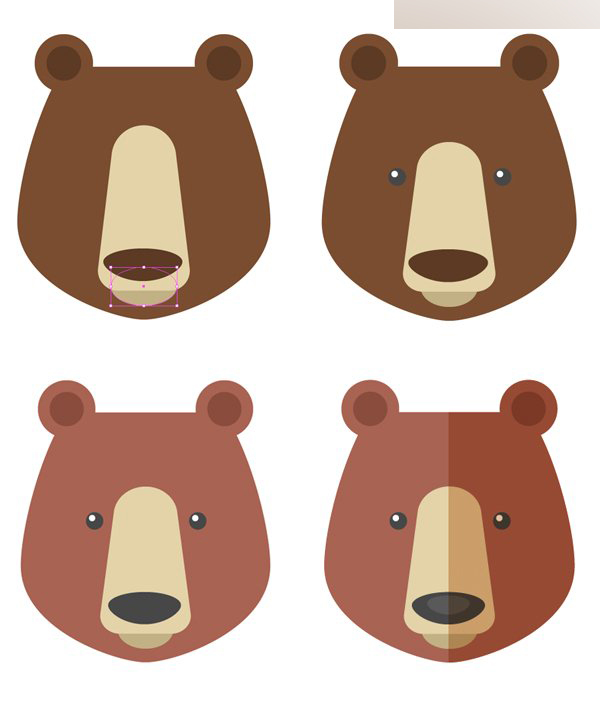添加一个小椭圆在鼻桥底部的下面,形成下颌。 添加眼睛到熊的面部,如果你觉得熊的脸太暗了,可以使棕色的部分亮一点。