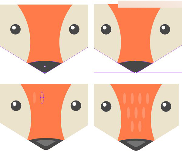 制作一个小的浅橘色的压扁的椭圆,并将其放置到鼻桥的左边。 选择这个形状,按住 Alt-Shift并向右拉动椭圆制作一份复本。 按住Control+D一次形成更多复本。 制作更多列的椭圆,将它们放在纵横的位置上。 这样,我们就描绘了具有风格化的毛皮狐狸的鼻子。