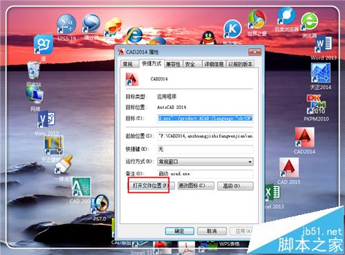 4、进入到CAD2014的属性界面,点击左下方的“打开文件夹位置”,找到安装文件夹。不建议慢慢去找,也许忘记了安装在哪个磁盘,这个方式是最有效最快捷的。