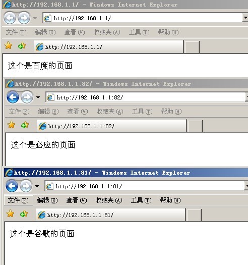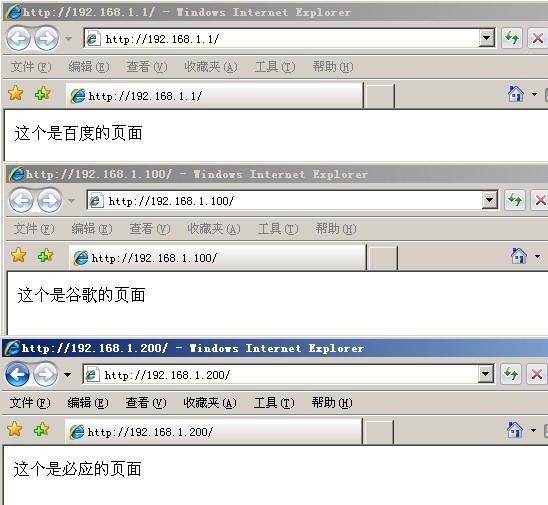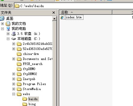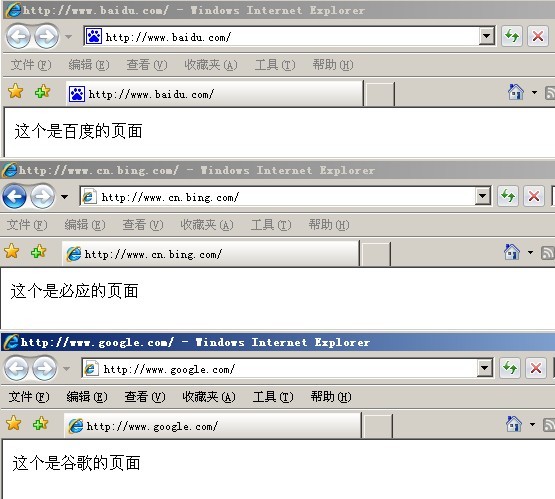 其中我在每个自己的搜索引擎下面新建了一个index.htm文件,分别对页面进行了百度、谷歌、必应的备注。方便我们测试的查看。