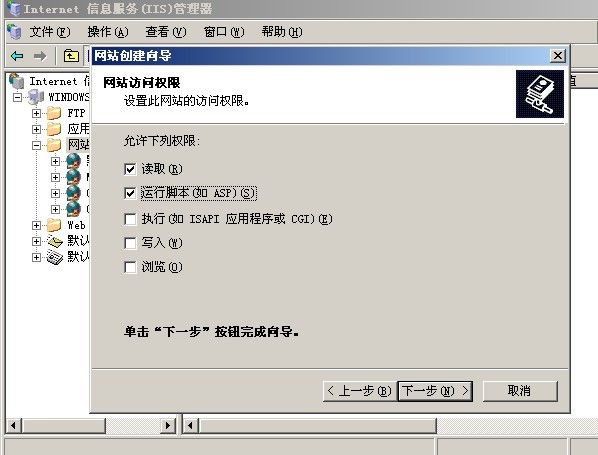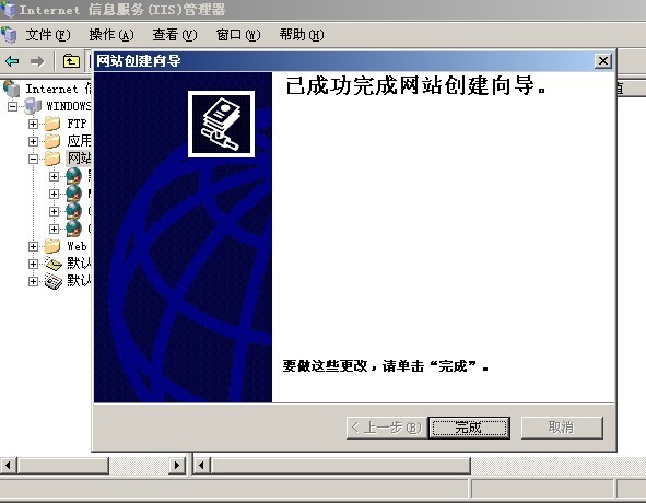 双击我们的iis服务器,在Internet信息服务(IIS)管理器左侧找到网站的文件夹,然后点击右击,新建->网站,在弹出来的网站创建向导中下一步,在网站描述中输入百度,下一步,网站的IP地址,选择网卡的IP地址,我这里是192.168.1.1,端口默认还是80,下一步,路径选择我们刚刚新建百度的文件夹下面,下一步,先勾选读取,运行脚本这两个先把,下一步,就可以看到完成创建网站向导了。