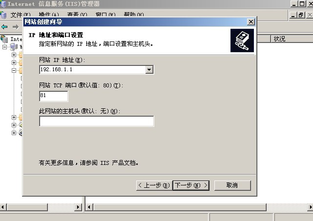 接来下我们要开始配置IIS了,首先我们把这个问题变得简单一点,题目变为相同的IP,不同的端口访问不同的网站。这个对于一般的程序员应该没有多大问题。