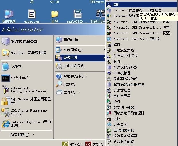 绕了这么多,接下来我们回到这个题目,相同的IP,相同的端口配置不同的网站,需要配合DNS和IIS网站中的主机头。还是看操作吧,首先我们还是确定已经安装了DNS服务器,在开始->管理工具->DNS,打开。
