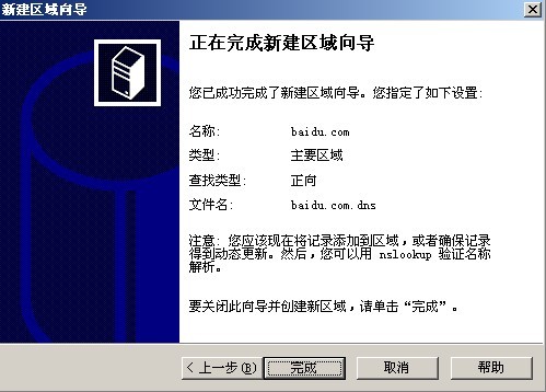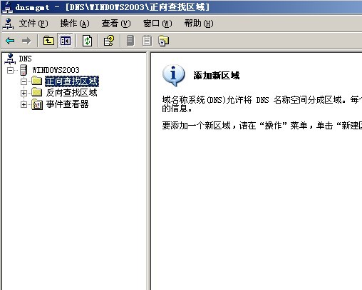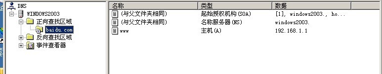 在DNS->WINDOWS2003->正向查找区域,右击新建区域,弹出新建区域向导对话框,下一步,默认下一步,区域名称中,输入网址,比如百度的话是baidu.com,下一步,默认下一步,不允许动态更新,下一步,完成了向导。这个时候我们发现在正向查找区域有了baidu.com了,好了,接下来我们再在baidu.com文件上右击,选择新建主机。在新建主机中添加名称为:www,IP地址为192.168.1.1然后选择添加主机。此时右边可以看到多一个A记录了。