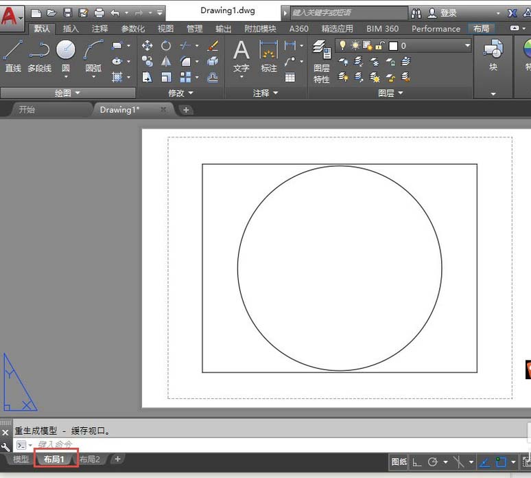 2、为了加快操作速度,我们建立一张最简单的图纸,在空图的模型空间画一个圆,然后切换到布局空间,布局空间默认有一个视口,如图所示。