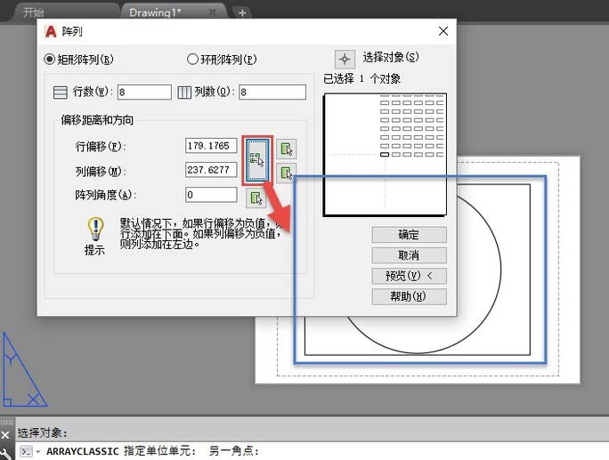 4、单击行偏移和列偏移后面的大按钮,在图中拾取一个比视口稍大的方框,如图所示。