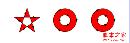 3. 稍微复杂一点的是fill-rule属性。这个属性定义了判断点是不是属于填充范围的算法;除了inherit这个值外,还有两个取值: nonzero:这个值采用的算法是:从需要判定的点向任意方向发射线,然后计算图形与线段交点的处的走向;计算结果从0开始,每有一个交点处的线段是从左到右的,就加1;每有一个交点处的线段是从右到左的,就减1;这样计算完所有交点后,如果这个计算的结果不等于0,则该点在图形内,需要填充;如果该值等于0,则在图形外,不需要填充。看下面的示例: