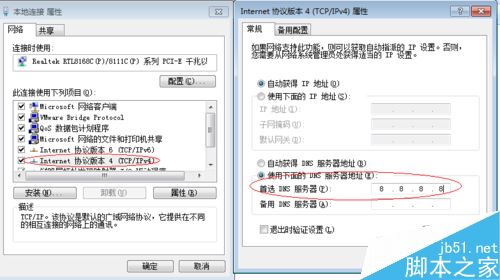 选择【IPv4协议】,双击打开,再DNS地方填入8.8.8.8 完成【确认】即可