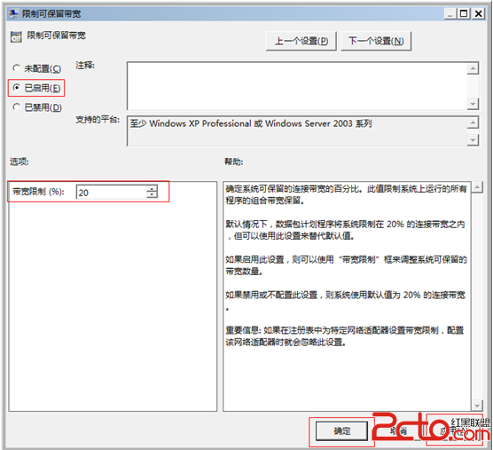 出现以下窗口,选中“已启用”,设置带宽限制为“0”,然后先单击“应用”最后单击“确定”即可破解windows默认限制带宽20%。