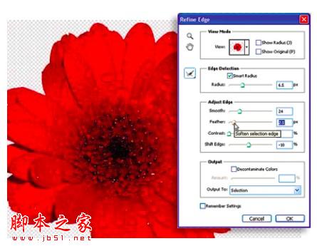 回到第9步中打开的花朵的文件,使用快速选择工具选中花瓣。打开调整边缘对话框,将只能半径设置为6.5,平滑设置为24,羽化设置为2.1。最后将移动边缘设置为-10%,彻底移除背景像素。
