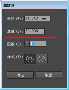 5、在螺旋线工具状态下,鼠标点击一下画板,可以出来一个参数窗口;半径越大范围就越大,衰减为100%时,就相当于画圆了,如图所示;