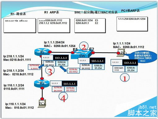 a)PC1发现目标IP110.1.1.2(网络号110.1.1.0)与本机不在同网段(掩码为24位,所以本机网络号为1.1.1.0),因此PC1会将数据包丢给网关,为了数据报文能够到达网关,PC1封装的报文里头会以网关的MAC作为目的MAC(网络数据传输,原目的IP不变,原目的MAC通过三层网络时会不断改变)。