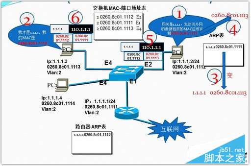 a)在正常情况下,PC1通过本地ARP表知道网关1.1.1.2的MAC地址为1.1.1.10260.8c01.1111,所以PC1封装包的时候会将目的MAC设置成路由器的MAC地址。交换机通过MAC-端口对应表能够正常的将数据报文从E1口转发给路由器,实现数据传输。