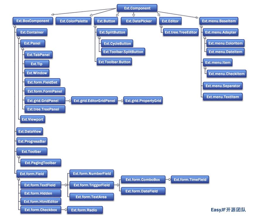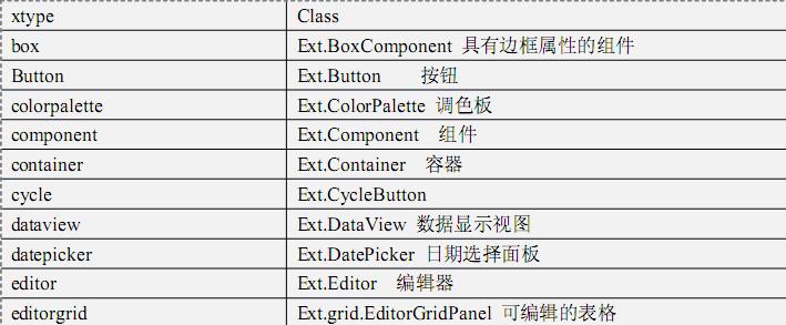 Ext2.0对框架进行了非常大的重构,其中最重要的是形成了一个结构及层次分明的组件体系,由这些组件形成了Ext控件。Ext组件由Component类定义,每一种组件都有一个指定的xtype属性值,通过该值可以得到一个组件的类型或者是定义一个指定类型的组件。